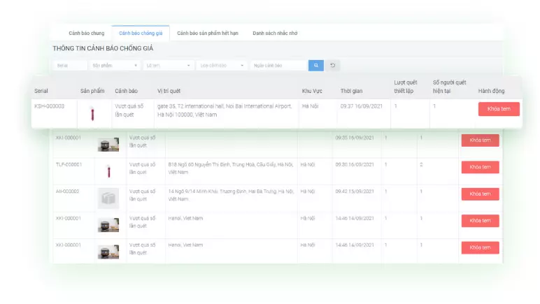 - Khóa tem từ xa trên hệ thống khi phát hiện cảnh báo hàng giả